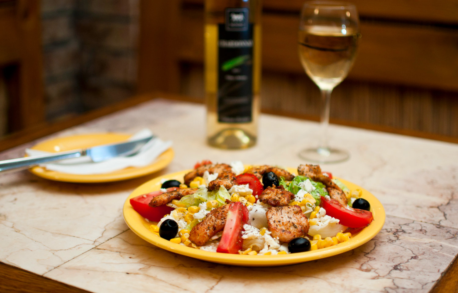 Čerstvý šalát, slaný syr, paradajky, čierne olivy, ochutené kuracie mäso, kukurica, bazalka, zálievka