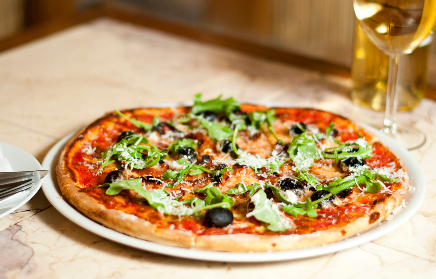 Paradajková omáčka, mozzarella, čierne olivy, sušené paradajky, rucola, grana padano